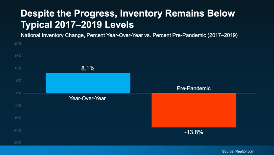 Data from Realtor.com proves that, even though inventory is up compared to last year, it’s still nearly 14% lower than it was during the last normal housing market (2017-2019):