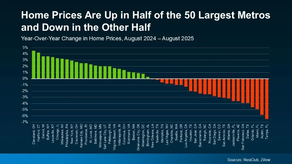 If you look at data from ResiClub and Zillow for the 50 largest metros, this becomes very clear. The real story is split right down the middle. Half of the metros are still seeing prices inch higher. The other half? Prices are coming down slightly (see graph below).